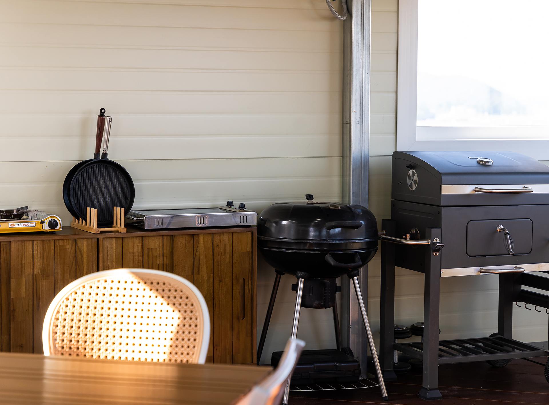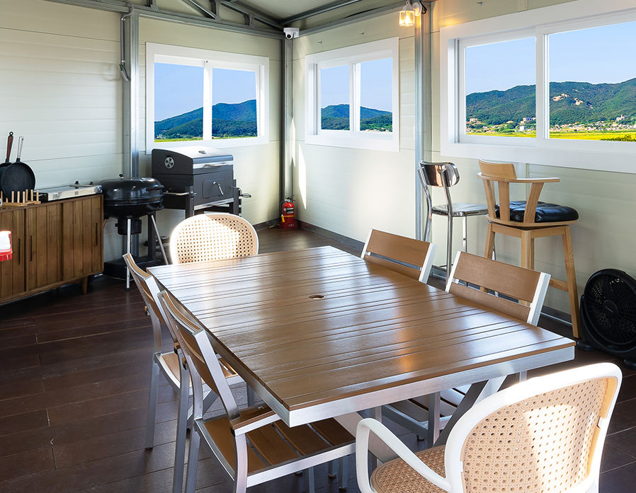 테라스 한켠에 실내형 바베큐장이 마련되어 있습니다. 사계절, 우천시에도 이용 가능하며, 시원한 바다와 노을지는 풍경을 보며 프라이빗하게 바베큐 파티를 열어보세요.